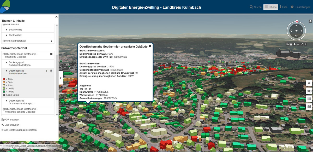 Der Landkreis Kulmbach besitzt mit dem Auf- und Ausbau des Digitalen Energie-Zwillings eine umfassende Datenlage, um grundstücksgenau Energiepotenziale für verschiedene Bereiche aufzuzeigen. Für alle Gebäude und Grundstücke im Landkreis können im Digitalen Energie-Zwilling die Solarpotenziale für Photovoltaik und Solarthermie, die Gründachpotenziale, der Jahreswärmebedarf für unsanierte und vollständig sanierte Gebäude, die Erdwärmepotenziale für oberflächennahe Geothermie, die Deckungspotenziale für die Wärmepumpentechnologie, also für Erdwärmekollektoren, Erdwärmesonden und Grundwasserwärmepumpen abgerufen und ausgewertet werden.