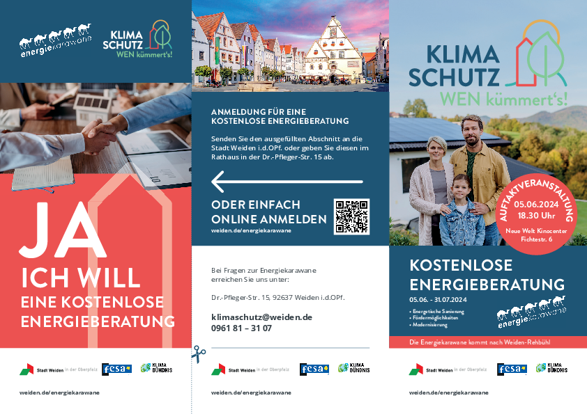 Mit der „Energiekarawane“ führt die Stadt Weiden im Juni/Juli 2024 erstmalig im Stadtgebiet eine quartiersbezogene, aufsuchende Energieberatungskampagne durch. Im Rahmen der Aktion wird das Prinzip herkömmlicher Energieberatung umgekehrt, indem Gebäudeeigentümer/-innen eines vorab definierten Quartiers durch ein personalisiertes Anschreiben eine kostenfreie Energieerstberatung am eigenen Objekt angeboten wird.